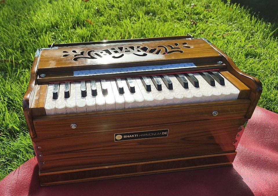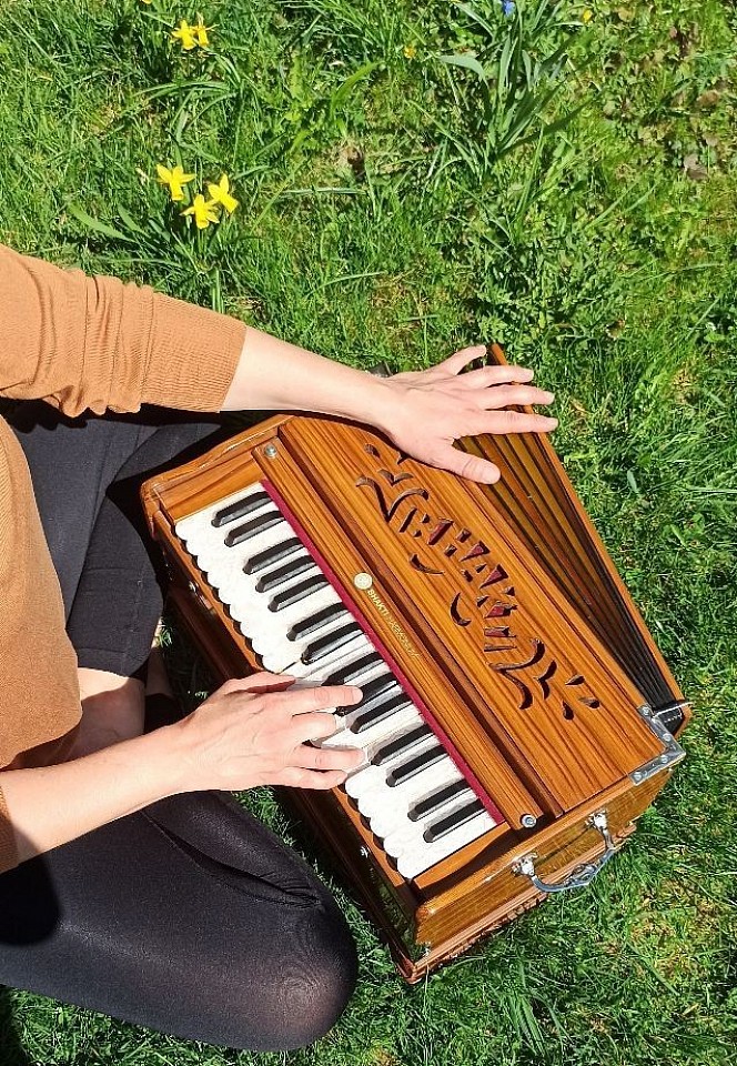Ich begleite die Stunde live mit meinem Harmonium, dessen sanfte Töne die Mantren unterstützen und eine besondere, meditative Atmosphäre schaffen.